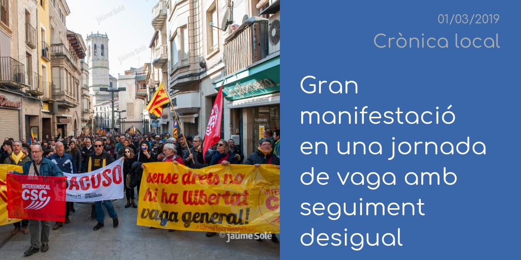 Aquesta setmana dediquem la primera plana de la secció dedicada a l'actualitat local a explicar com es va desenvolupar la jornada de vaga general convocada el passat 21 de febrer. Alhora, a Crònica Local recollim l'incendi que es va produir dilluns passat a la matinada en un immoble del carrer d'Urgell, parlem de les novetats que inclou enguany el Concurs de Grups de Teatre que organitza la BAT, relatem que dues germanes de la nostra ciutat han presentat l'aplicació que han dissenyat en el marc del Mobile World Congress i recollim la resposta viral de Quim Vilamajó a Arcadi Espada.