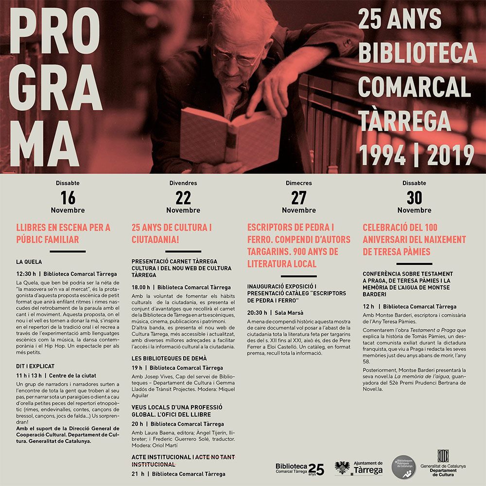 El divendres 22 de novembre, sota el lema 25 anys de cultura i ciutadania, se succeiran diferents actes que culminaran a les 9 del vespre amb una trobada de memòria col·lectiva que aplegarà càrrecs institucionals, treballadors i persones vinculades a la Biblioteca durant els darrers 25 anys. Abans, a les 6 de la tarda, es presentarà el Carnet Tàrrega Cultura i el nou web de l’àrea de Cultura. Seguidament, a les 7 de la tarda, prendran el relleu les taules rodones "Les biblioteques del demà" i "L’ofici del llibre · Veus locals d’una professió global", que englobaran bibliotecaris, escriptors, llibreters i editors.