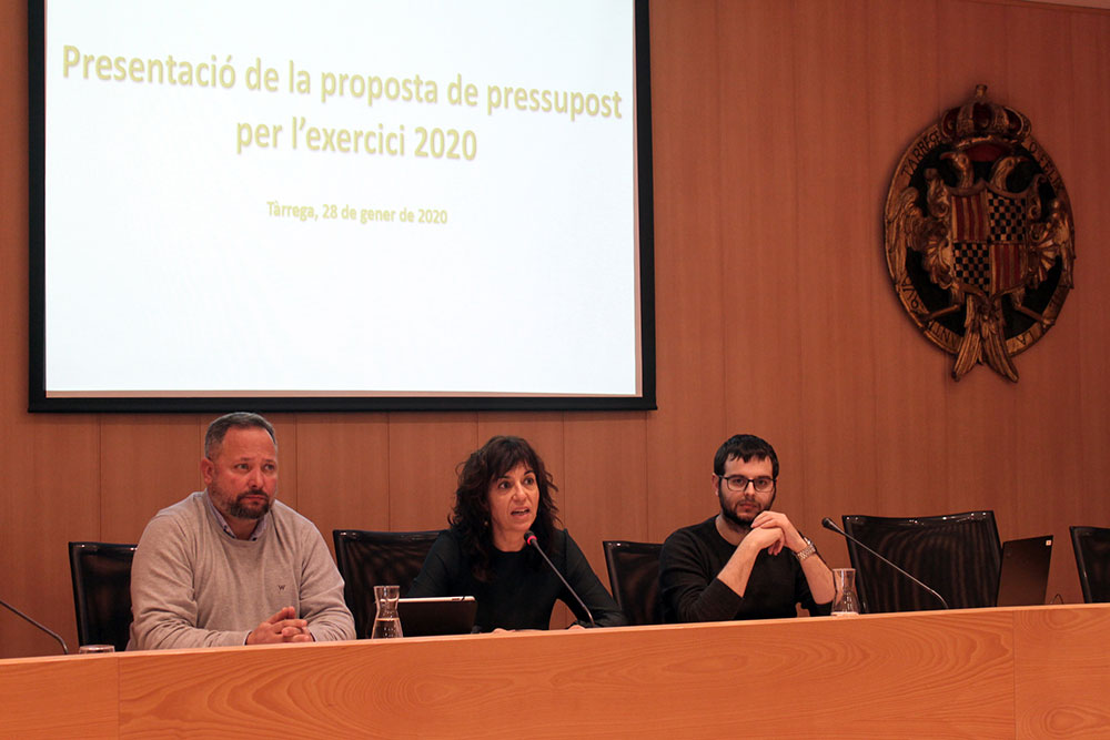 L’Equip de Govern de l’Ajuntament de Tàrrega ha presentat avui la proposta de pressupost municipal corresponent a l’exercici 2020. Els nous comptes ascendiran a 17.862.429 euros, xifra un 2,8% inferior als comptes de l’any 2019. Sumant els 8.000 euros de la Societat Urbanística Municipal d'Habitatge Social de Tàrrega (SUMTA) i 1.109.200 euros de l’EPEL Fira Tàrrega, l’import consolidat per al 2020 ascendeix fins als 18.979.629 euros. El nou pressupost s’ha dissenyat amb pragmatisme i ajustant-se a una reducció prevista d’ingressos (s’estima, per exemple, que les recaptacions de l’IBI urbà i les plusvàlues baixin un 1,75% i un 33% respectivament). Tot i això, Tàrrega fa un esforç financer per augmentar la dotació destinada al personal (amb millores salarials i creació de noves places) i per mantenir les partides destinades a despeses corrents i subvencions. Així ho han destacat Alba Pijuan Vallverdú, alcaldessa de Tàrrega i portaveu del grup ERC-MES-AM; Daniel Esqué, regidor de Finances i Transparència i portaveu del grup CUP; i Silveri Caro, regidor portaveu del grup PSC (vegeu fotografia).