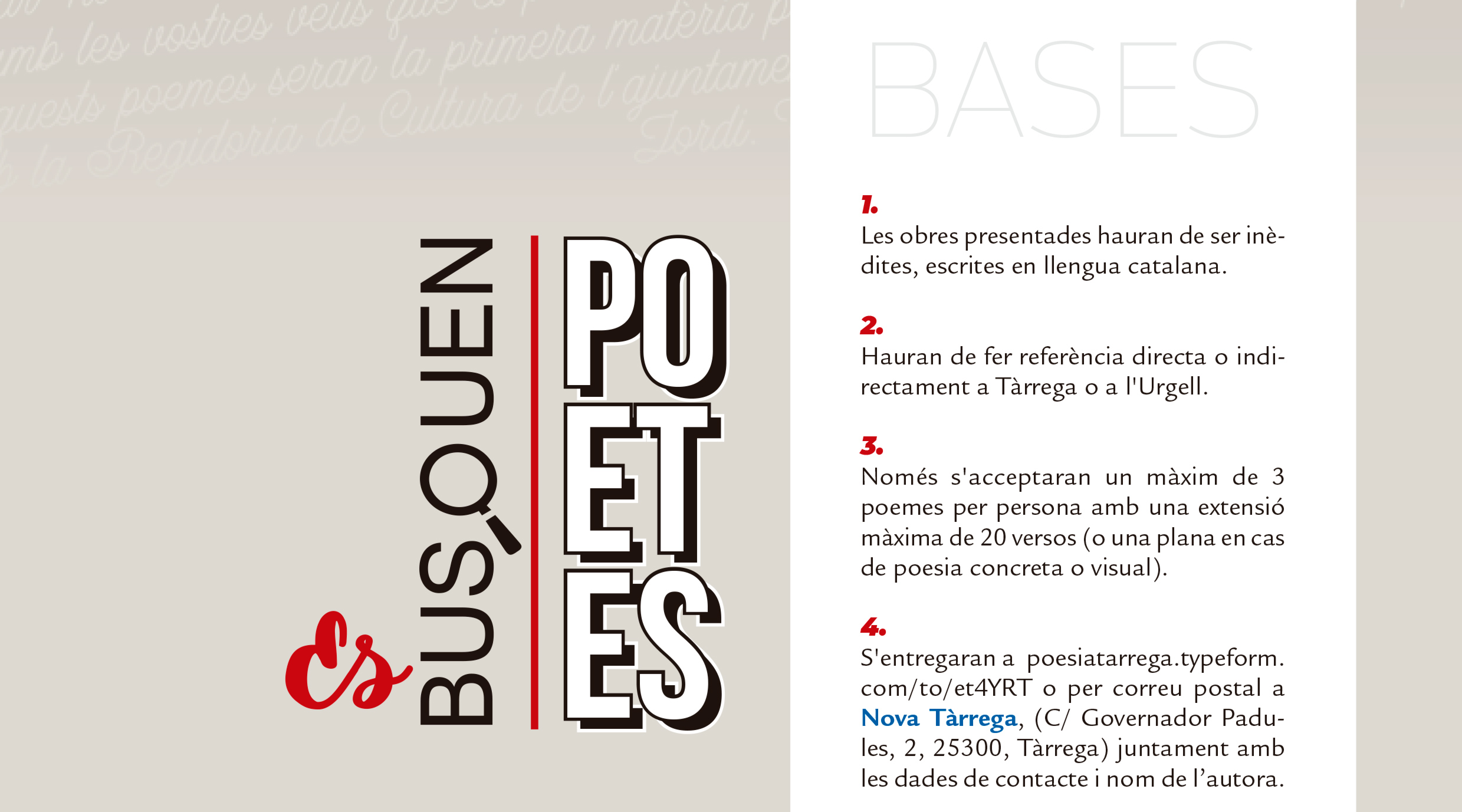 - S'entregaran a poesiatarrega.typeform.com/to/et4YRT o per correu postal a Nova Tàrrega, (C/ Governador Padules, 2, 25300, Tàrrega) juntament amb les dades de contacte i nom de l’autora.