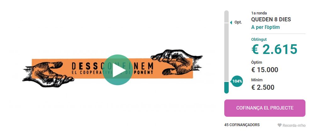 Després d’una setmana amb la campanya de micromecenatge a la plataforma Goteo, ahir es va superar la quantitat mínima econòmica establerta de 2.500 euros per poder començar a ajudar a les cooperatives del territori. Tot ha estat possible gràcies a les aportacions de 45 persones i al suport de totes les persones que han donat difusió de la campanya, que ajudaran al teixit cooperatiu del territori a pal·liar els efectes econòmics en un moment vital per continuar la seva activitat i fer front a la crisi i a la situació d’emergència actual.
