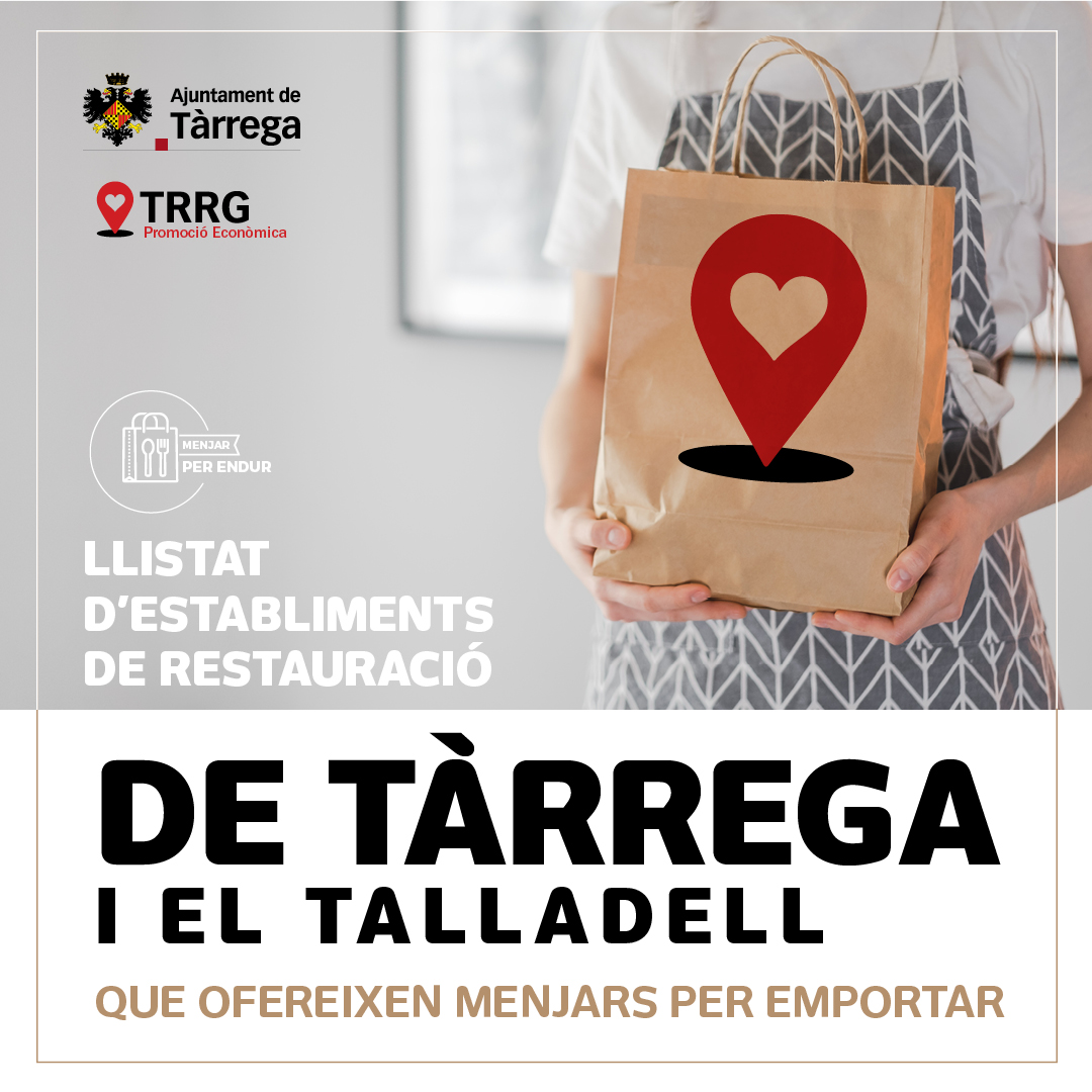L’Ajuntament de Tàrrega ha llançat una campanya per donar suport als bars i restaurants de la ciutat amb motiu del tancament decretat per la Generalitat de Catalunya davant la segona onada de la Covid-19. Mitjançant aquesta acció, la Regidoria de Promoció Econòmica convida la ciutadania a demanar menjar per emportar en aquests establiments (servei que sí estan autoritzats a oferir) per ajudar-los a superar la difícil situació que travessen a causa de la pandèmia. Així, a través del web municipal i les xarxes socials, el consistori difon un directori que dona a conèixer els establiments del sector de l’hostaleria a Tàrrega que fan servei de menjar per emportar. El llistat també inclou establiments situats a l’EMD El Talladell. Així mateix, per donar-se d’alta o modificar la informació, els mateixos establiments poden trametre les seves dades a promeco@tarrega.cat o al telèfon 973 313 679.