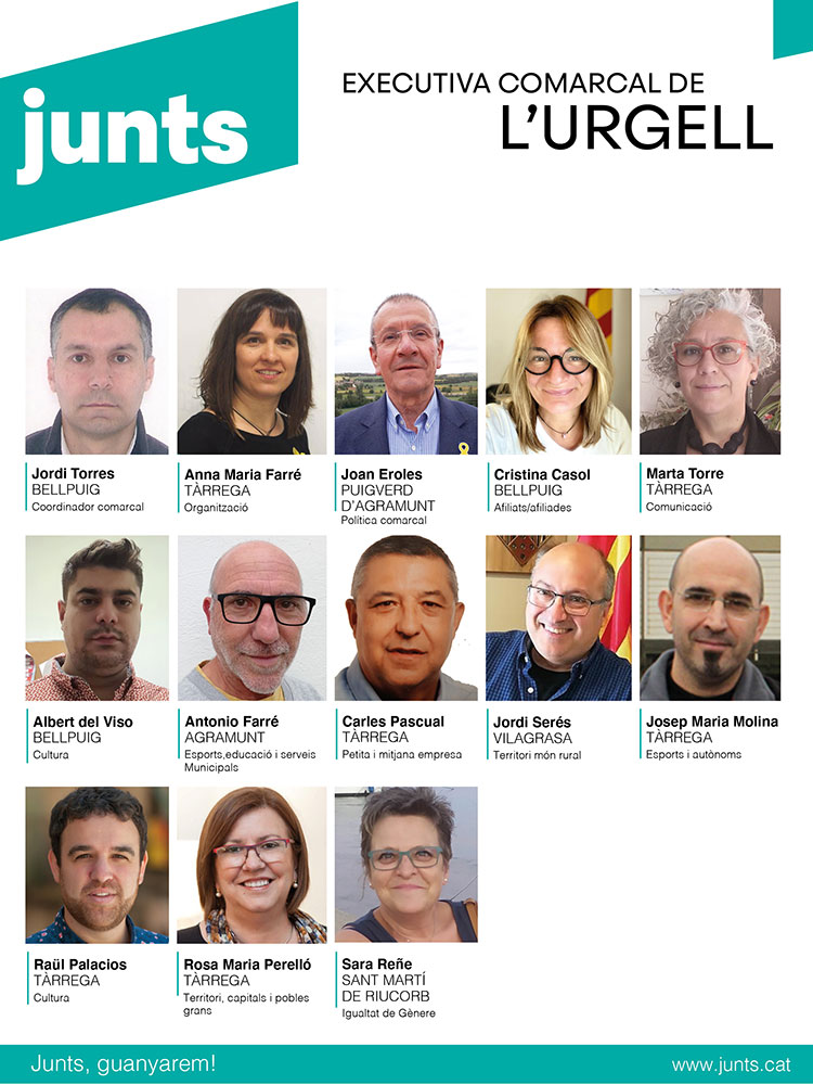 Aquestes són les persones, la seva localitat i la responsabilitat que desenvoluparan en l’executiva comarcal de Junts per Catalunya a l’Urgell: