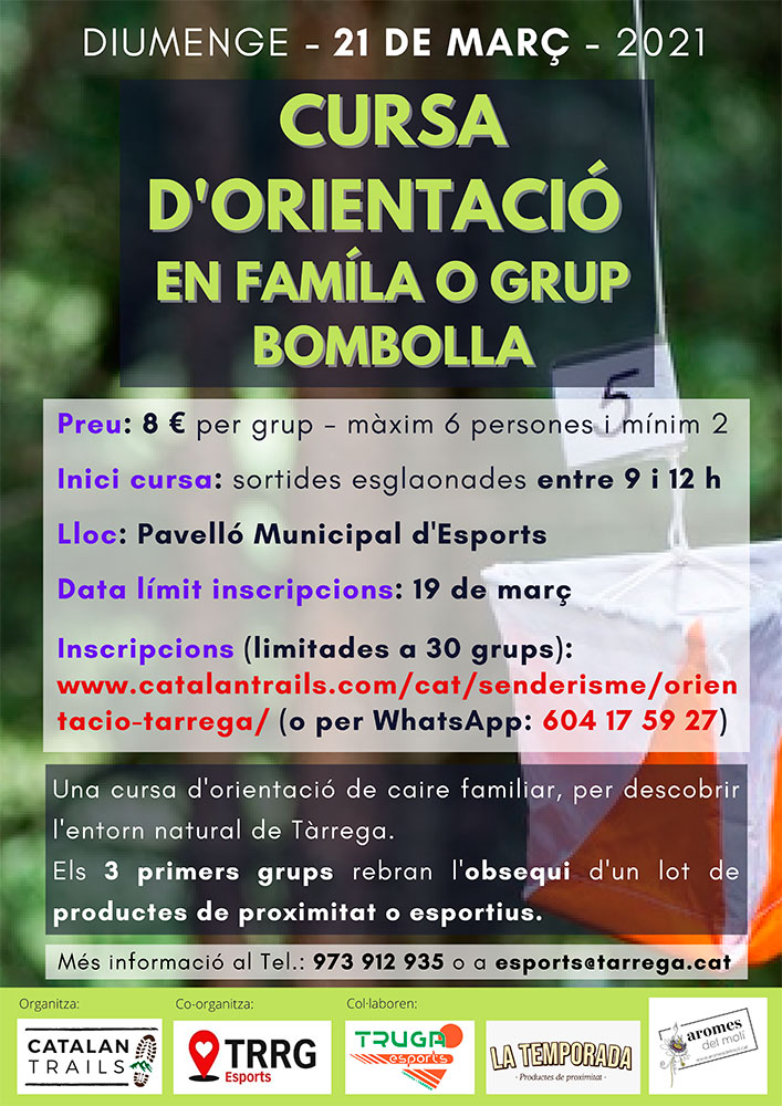 La Regidoria d'Esports anuncia pel proper diumenge 21 de març l'organització d'una cursa d'orientació en família o en grups bombolla d'un màxim de 6 persones cadascun. El punt de sortida i arribada serà el pavelló municipal i l'espai pel que principalment transcorrerà serà el Reguer, Parc esportiu, cap al Talladell, zona del canal i camí de Granyena. Els grups sortiran esgraonats des de les 9 fins a les 12. Se'ls comunicarà l'hora exacta una vegada realitzada la inscripció. Es preveu que cada grup recorri uns 8-12 quilòmetres, depenent de l'estratègia que decideixi seguir i de la durada. A part de ser una bona oportunitat per fer esport i estirar una mica més les cames, també es tracta de fer una activitat de caire familiar per descobrir o redescobrir l'entorn natural de Tàrrega. Les inscripcions ja es poden realitzar a www.catalantrails.com/cat/senderisme/orientacio-tarrega, al preu de 8 euros per grup. Hi haurà un obsequi d'un lot de productes de proximitat o esportius, per als tres primers grups que facin el recorregut. Els interessats podreu rebre més informació a esports@tarrega.cat o al tel. 973 312 935.