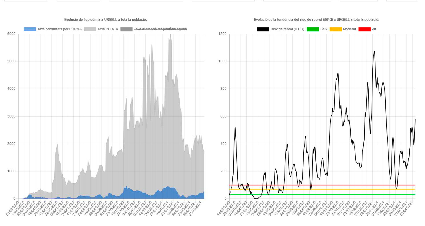 Pel que fa a la situació epidemiològica, ha empitjorat respecte la setmana passada. De fet, el risc de rebrot ha pujat tant que torna a situar-se a nivells que no es veien des de la primera quinzena de febrer, al final de la tercera onada. Avui el risc a l'Urgell, on hi ha 165 casos actius de la malaltia, és de 580 punts (divendres passat era de 376) mentre la velocitat de contagi (Rt) era similar, 1,22 (divendres 0,96, havia baixat per sota d' per primer cop en deu dies)
