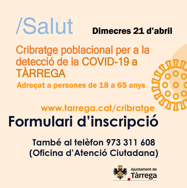 El Departament de Salut ha anunciat que realitzarà un nou cribratge poblacional per a la detecció de la Covid-19 a Tàrrega el dimecres 21 d’abril. Les proves s’efectuaran al Pavelló Municipal d’Esports, de 2/4 de 10 del matí a 2/4 de 6 de la tarda, i s’adrecen a persones asimptomàtiques d’entre 18 i 65 anys d’edat. Es fa una crida sobretot a les persones que hagin tingut contacte estret amb casos positius de coronavirus en l’àmbit laboral. Es dona la circumstància que Salut ha diagnosticat durant els últims dies una elevada xifra de nous casos positius a Tàrrega que corresponen a treballadors de petites i mitjanes empreses.