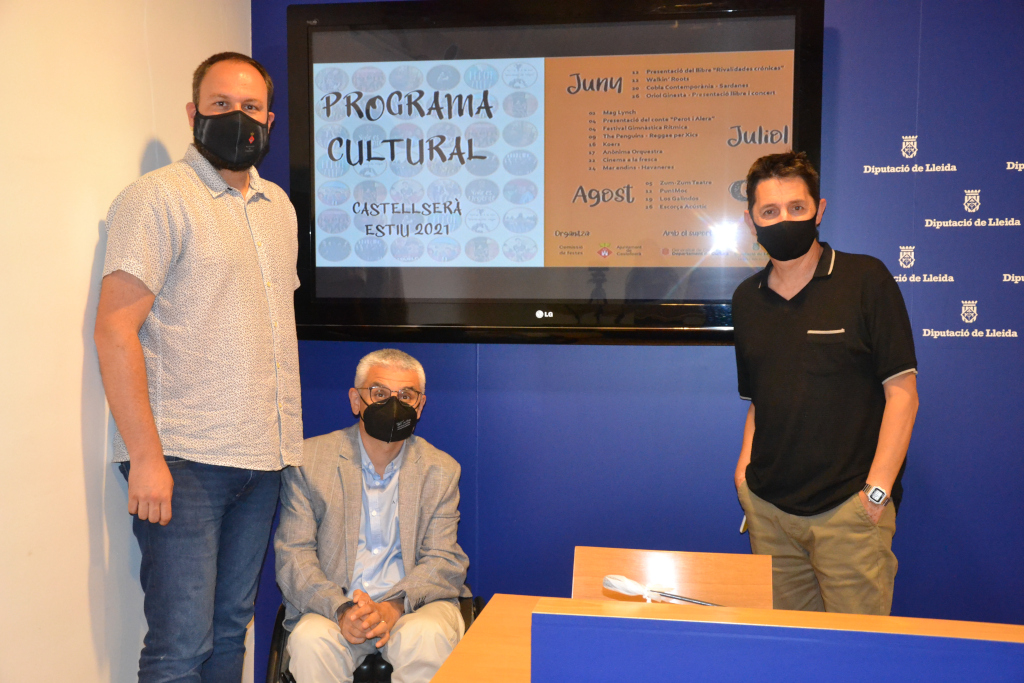 El vicepresident primer de la Diputació de Lleida, Jordi Latorre; l’alcalde de Castellserà, Marcel Pujol, i el membre de la companyia Zum-Zum Teatre, Ramon Molins, han participat aquest dimarts en la roda de premsa de presentació del Cicle Castellserà de Nit 2021 i de la programació cultural d’estiu 2021 de Castellserà.