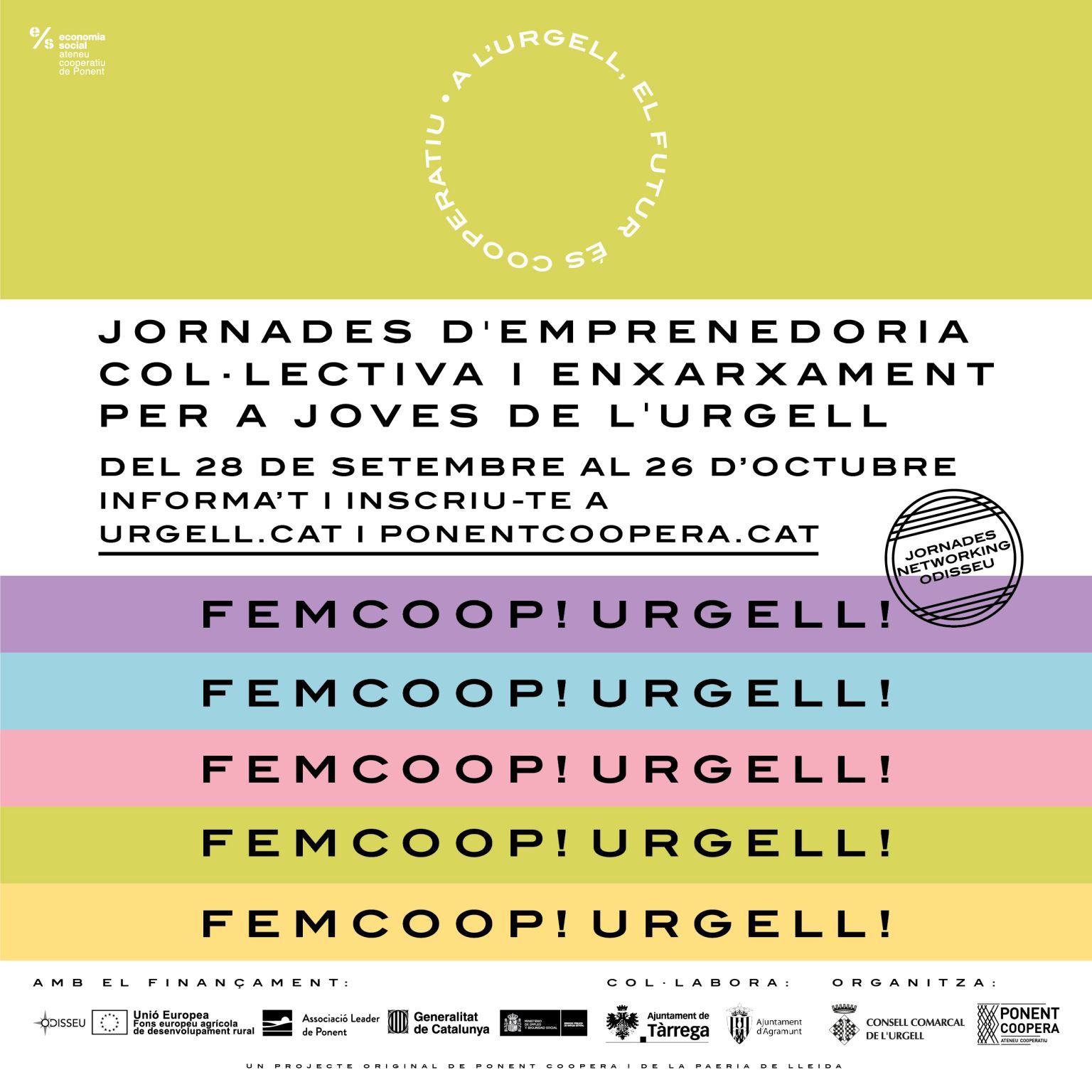 El Consell Comarcal de l’Urgell i Ponent Coopera organitzen Femcoop Urgell, unes jornades d’emprenedoria col·lectiva i enxarxament per a grups de joves de 18 a 35 anys amb interès en impulsar un projecte cooperatiu. Les jornades estan emmarcades en el programa ODISSEU.
