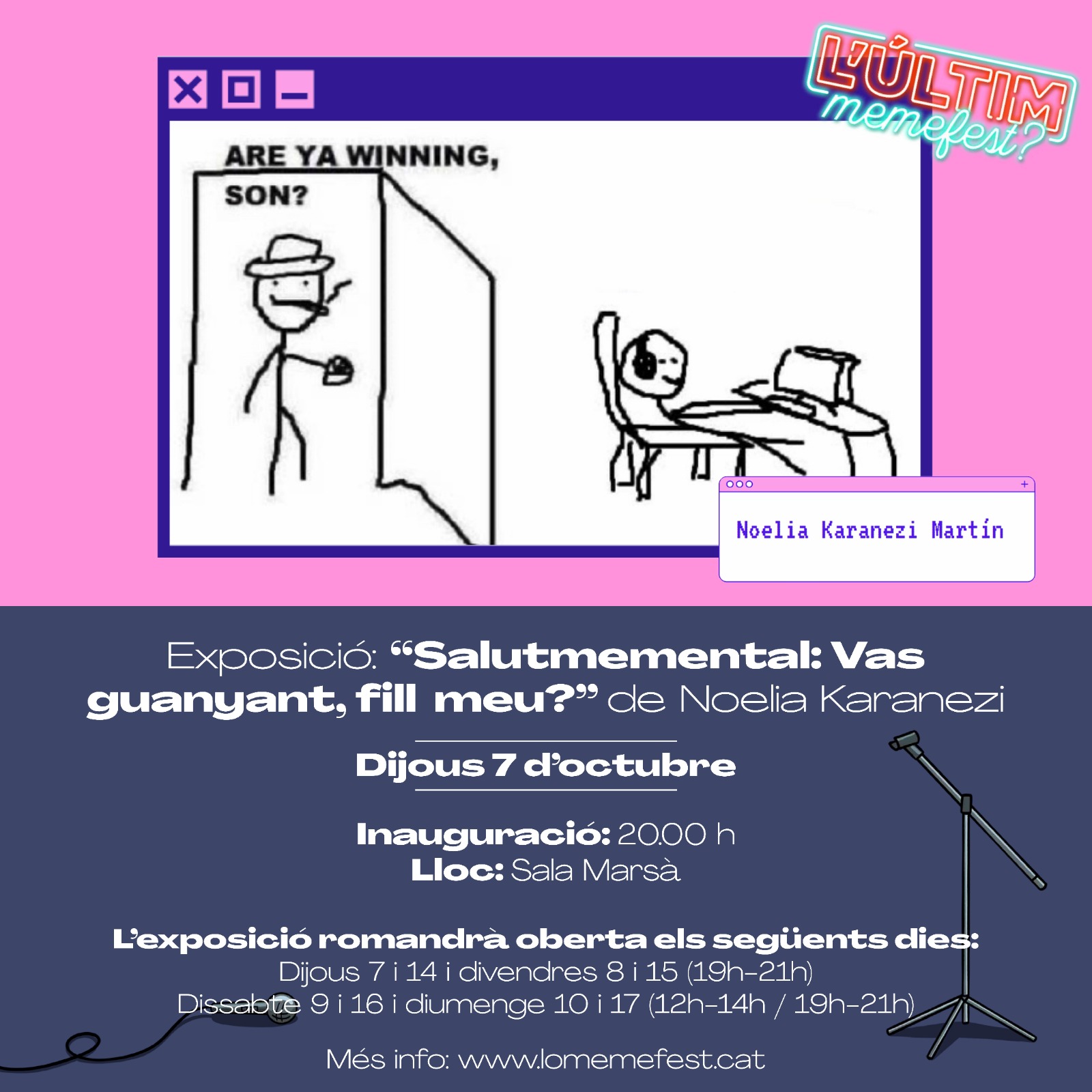 La tercera edició de Lo Memefest de Tàrrega, el festival d’humor de Ponent, inaugurarà aquest dijous l’exposició SalutMemental: Vas guanyant, fill meu? dissenyada per Noelia Karanezi, creadora de continguts i guionista del programa La Competència de RAC1. La mostra tractarà sobre com han viscut els joves la pandèmia de la Covid des del seu punt de vista i els problemes de salut mental que se n’han derivat a través de la recreació d’un mem que es va fer viral durant el confinament.