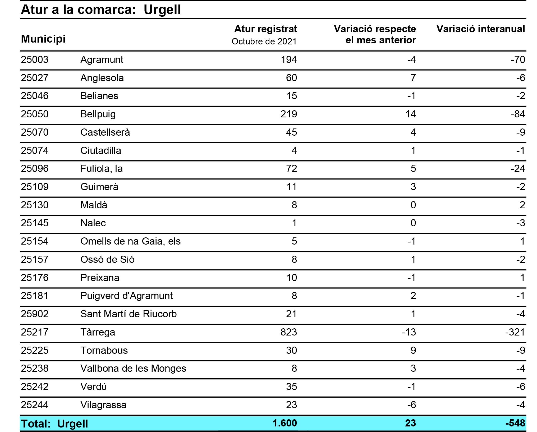 Els municipis que van sumar més persones a l'atur van ser Bellpuig amb 14 seguit de Tornabous amb 9 i Anglesola amb 7, mentre que els que van treure més persones de l'atur van ser Tàrrega amb 13 i Vilagrassa amb 6.