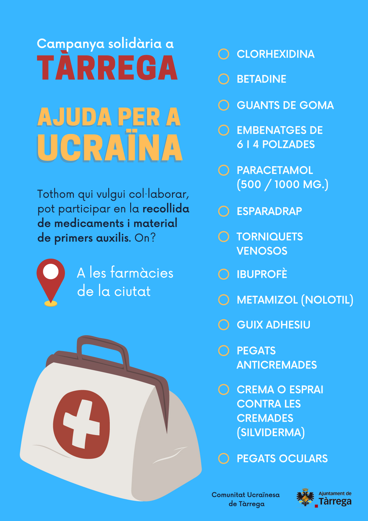 Aquells que vulguin col·laborar en aquesta campanya solidària poden portar medicaments i material de primers auxilis a les farmàcies de la ciutat. Es necessita: Clorhexidina, Betadine, guants de goma, embenatges de 6 i 4 polzades, Paracetamol, esparadrap, torniquets venosos, Ibuprofè, Metamizol (Nolotil), guix adhesiu, pegats anticremades, crema o esprai contra les cremades (Silviderma) i pegats oculars.