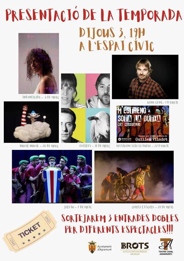 Agramunt impulsa la quarta edició del cicle d’arts escèniques i musicals Brots, que enguany oferirà un total de set muntatges entre els mesos de març i maig. La programació d’aquest 2022 compta amb propostes molt variades, amb grans dosis d’humor però també fortes dosis de realitat que tractaran temes com la pressió social, els clixés femenins, la frustració d’una generació marcada per la crisi i les ganes d’aprendre d’aquells que més difícil ho tenen. Tampoc hi faltarà un espectacle emmarcat en el centenari del naixement de Guillem Viladot.