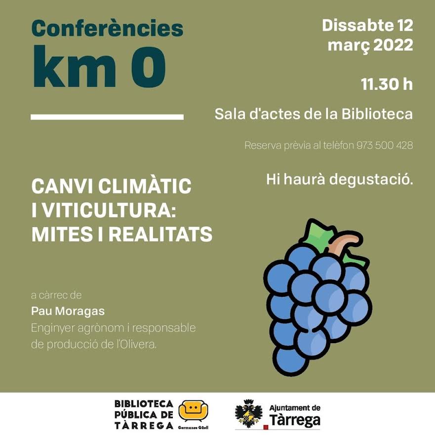 La biblioteca Germanes Güell de Tàrrega inicia aquest dissabte 12 de març una nova edició del cicle de conferències Km 0. Enguany, i com a novetat, totes les conferències estan relacionades temàticament amb el canvi climàtic i l'afectació que té a les nostres comarques. El cicle, que programarà fins a quatre xerrades fins al mes de juny, arrenca amb Canvi climàtic i viticultura: mites i realitats, que oferirà Pau Moragas, enginyer agrònom i responsable de producció de la cooperativa L'Olivera, a la sala d'actes de la biblioteca a 2/4 de 12 del migdia. L'objectiu principal d'aquestes xerrades és que professionals del nostre territori facin arribar a la resta de la ciutadania els seus coneixements i experteses.