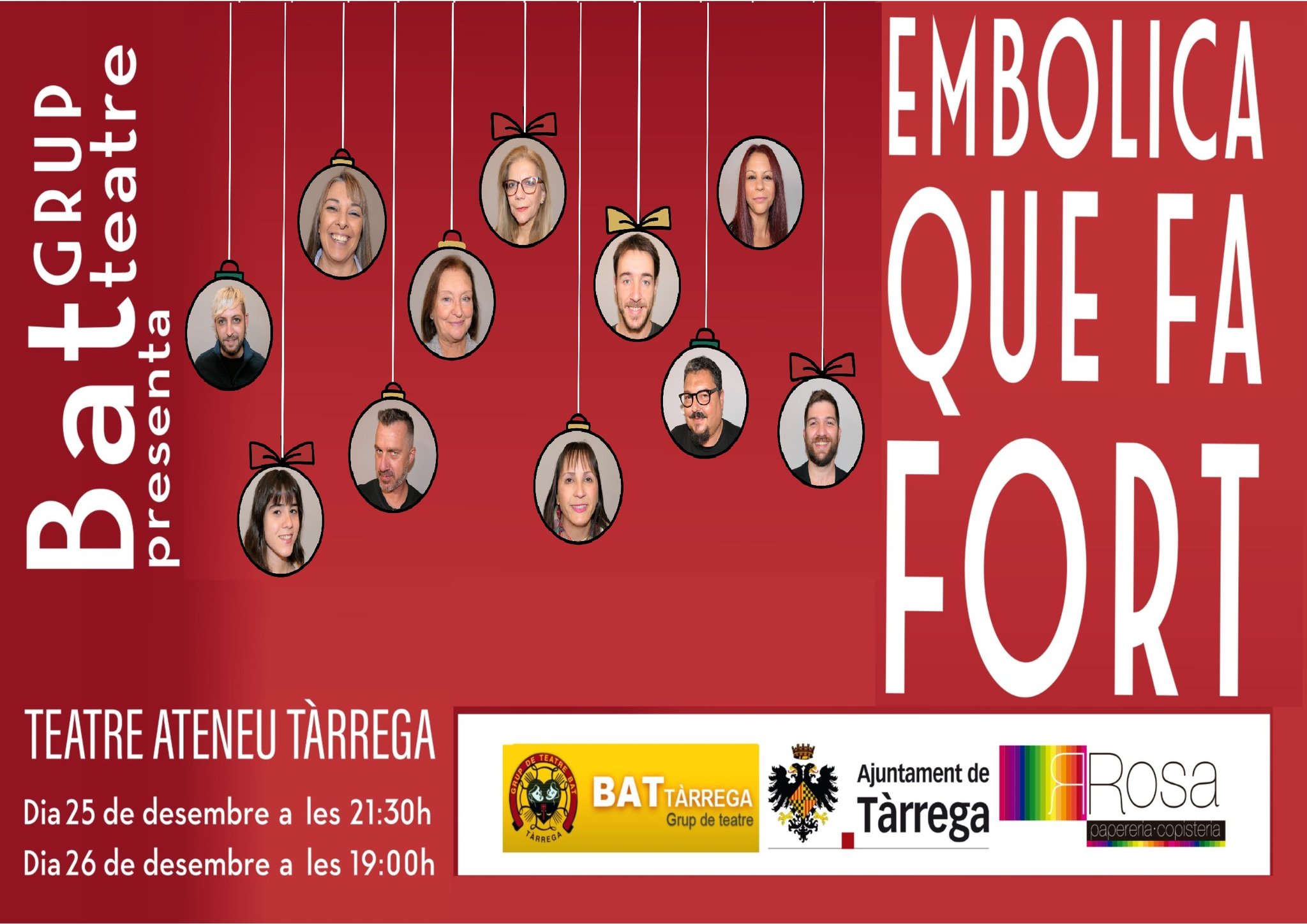 Com de costum, el Grup de Teatre BAT proposa passar els dies de Nadal (21:30h) i Sant Esteve (19h) gaudint del teatre. En aquesta ocasió, Joan Ribó dirigeix Embolica que fa fort, un text de Maribel Masip interpretat per Carles Cabrera, Sílvia Clop, Rosa Anna Sans, Gerard Bergalló, Maria Nadal, Mercè Riera, Alexandre Barquets, Laura Visa, Lorena Conejero, Pere Palomino i Estanis Farré. Intèrprets veterans i altres que debutaran seran els encarregats de representar aquesta comèdia d’embolics nadalencs.