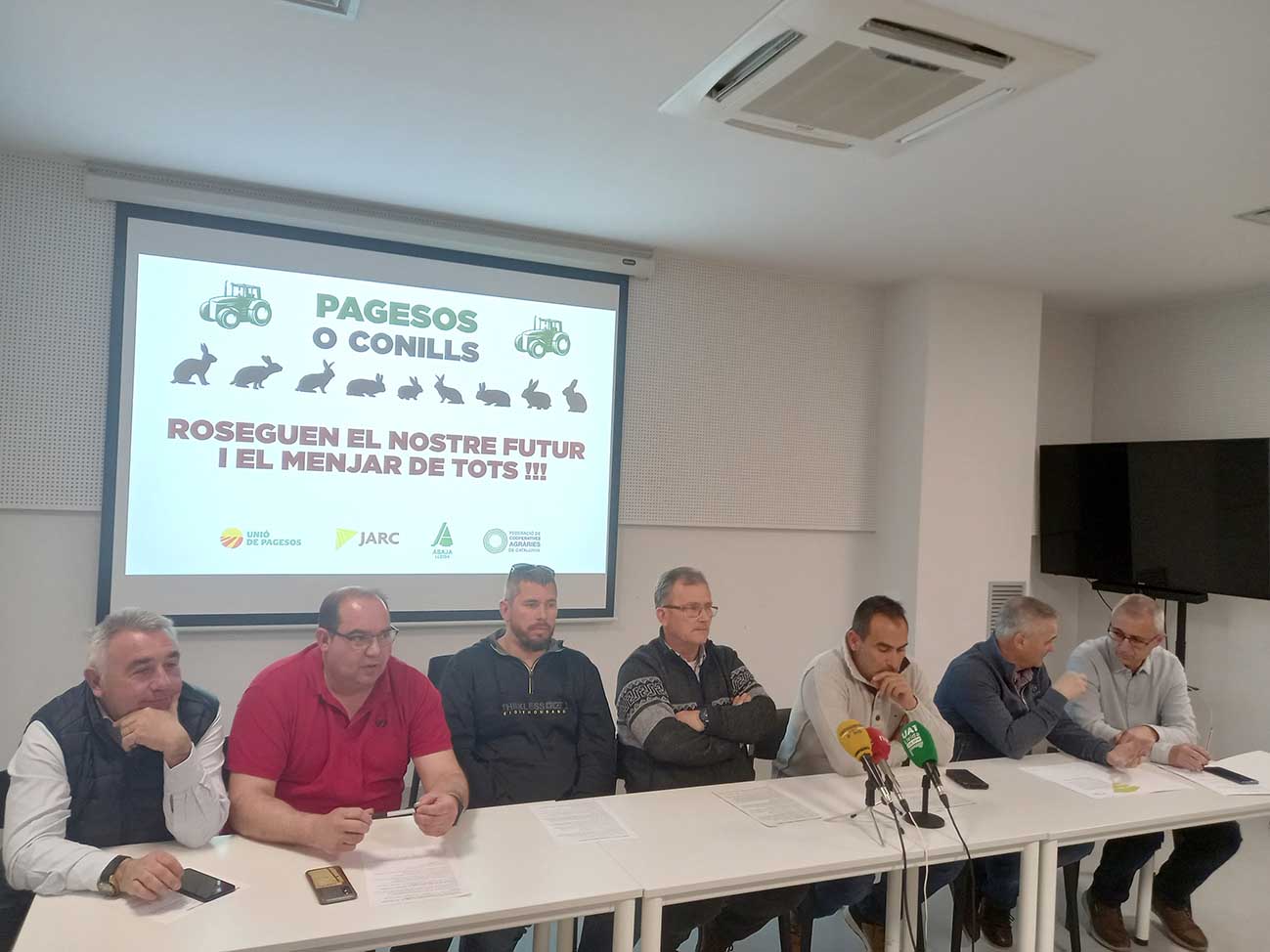 Pere Roqué (ASAJA), Nèstor Serra (Unió de Pagesos), Joan Piera, Ramon Boleda i Àlex Foix (Plataforma Pagesos o Conills), Lluís Viladrich (Joves Agricultors i Ramaders de Catalunya) i Santi Vergé (Federació de Cooperatives Agràries de Catalunya) han encapçalat la roda de premsa en la qual s'han mostrat "farts" de demanar sempre el mateix i que des de l'administració se'ls prengui "pel pito del sereno" o que se'ls faci "perdre el temps" amb reunions per no solucionar "res". En aquest sentit, els portaveus han defensat que la plaga de conills no s'acabarà amb "bones paraules, ni amb bones intencions", que és "el que ens ha ofert fins ara el departament".
