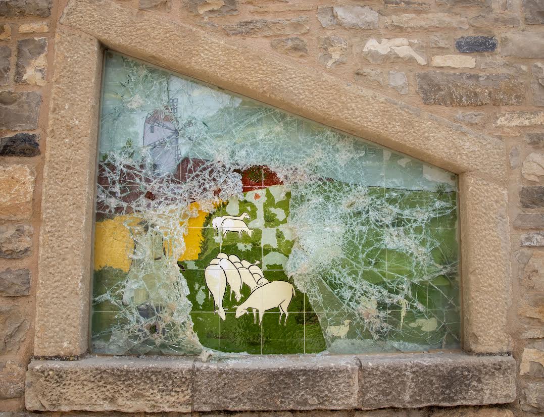 Apareix trencat el vidre que protegeix una de les majòliques de la Font del Congrés