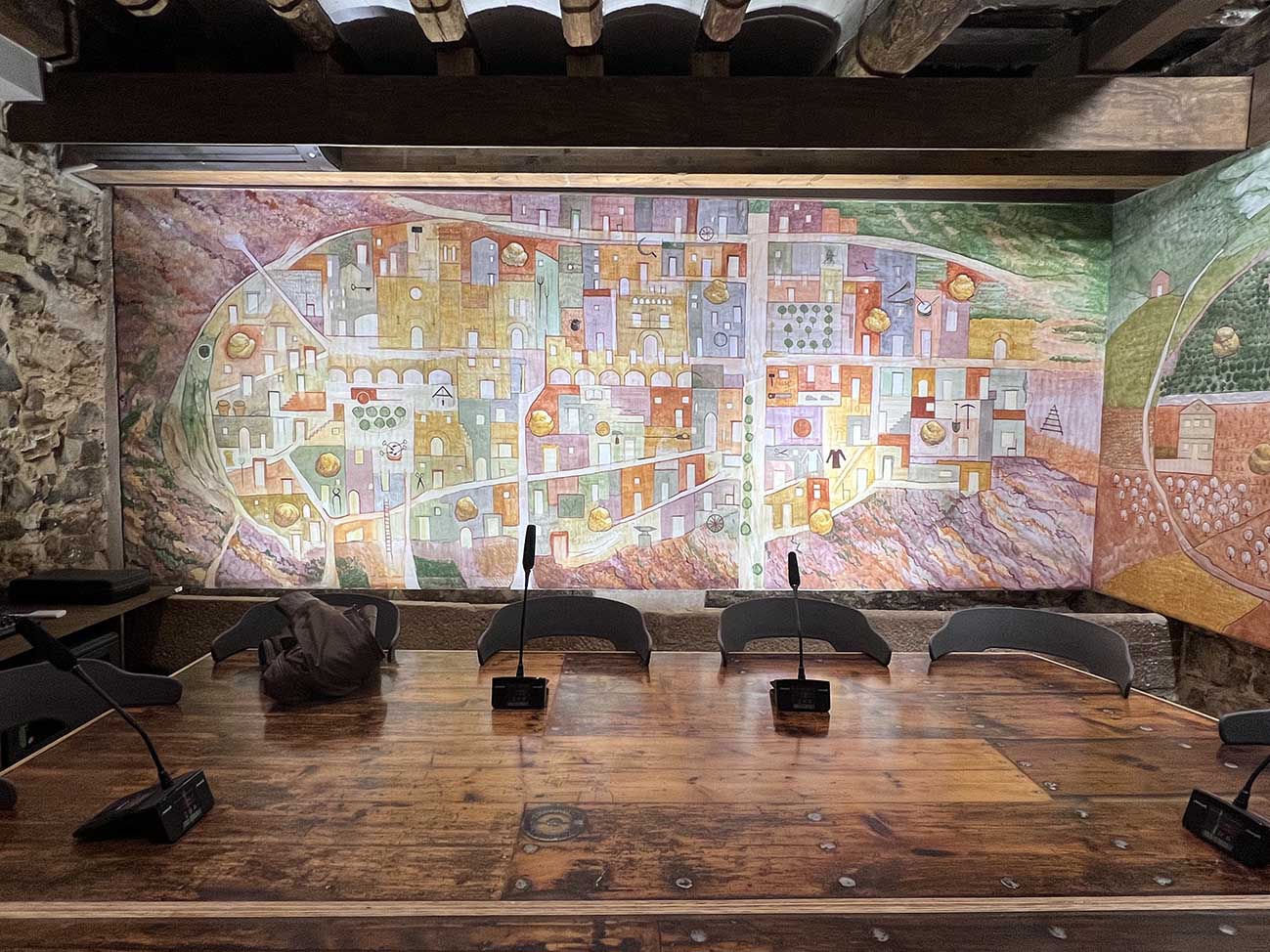 Sobre la pintura al fresc, Carme Miró declara que “per a nosaltres és una obra adient, que té sentit, en aquesta sala i d’aquesta manera. És una obra que fa badar i que fa badar en majúscules, en una recopilació de detalls que tots junts fan que ens adonem de la riquesa cultural que tenim. A més, arriba a tothom, a grans i a petits, perquè és alegre, fresca, amb molta llum i molt nostra. Una obra singular, que ens representa a tots els anglesolins i anglesolines”.