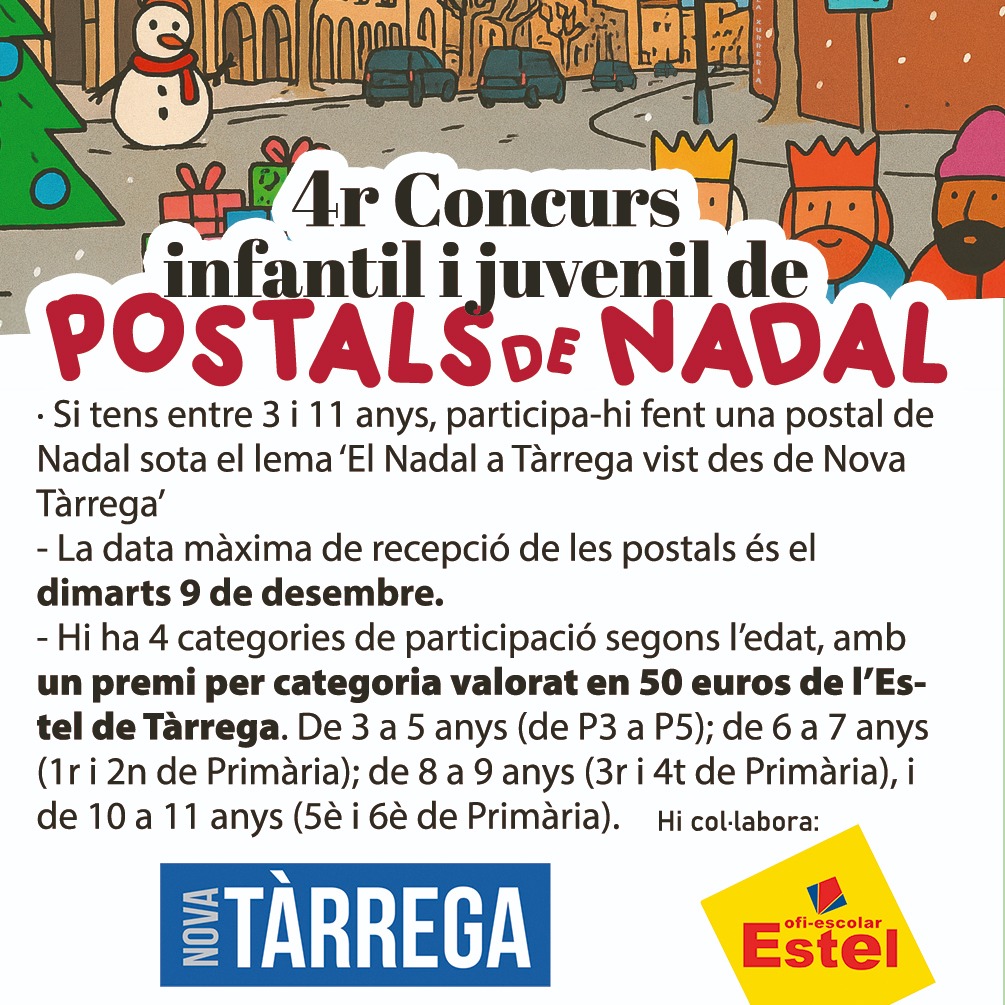 El setmanari Nova Tàrrega, en col·laboració amb la llibreria L’Estel, organitza el quart concurs infantil i juvenil de postals de Nadal, adreçat a infants i joves d’entre 3 i 11 anys. L’objectiu és que els participants creïn una postal de Nadal sota el lema ‘El Nadal a Tàrrega vist des de Nova Tàrrega’.