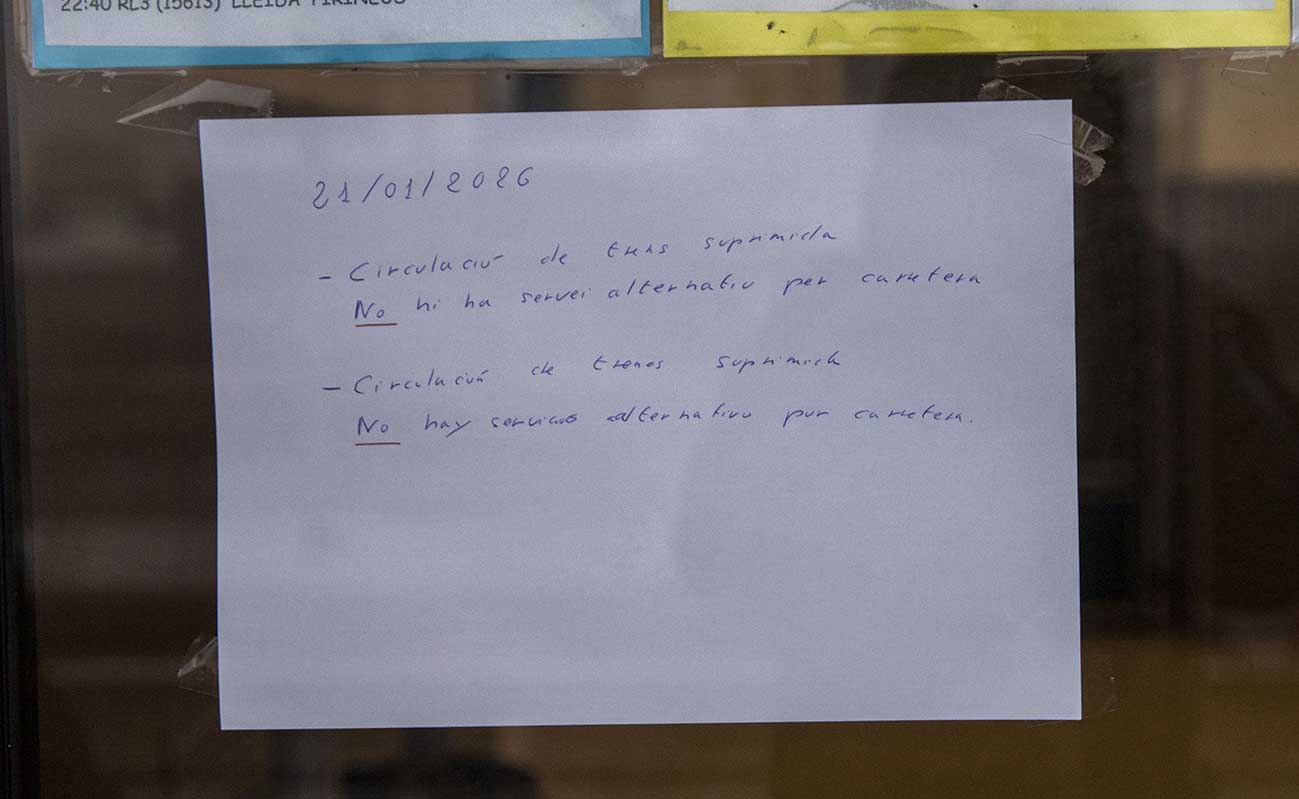 Un cartell escrit a mà informava que el servei ferroviari estava completament suspès i que no s'havia habilitat cap transport alternatiu per carretera. Davant la manca d'informació i opcions, els usuaris s’han vist obligats a buscar solucions pel seu compte. Molts han corregut fins a l'estació d'autobusos —situada davant de la de tren— amb l'esperança de poder continuar el seu trajecte. Tot i això, les places eren limitades i diversos passatgers s’han quedat a terra, havent d'esperar hores fins a la següent sortida. Aquesta situació ha provocat que nombrosos viatgers perdessin hores de classe o de feina. Altres han recorregut a familiars o amics per desplaçar-se amb cotxe.