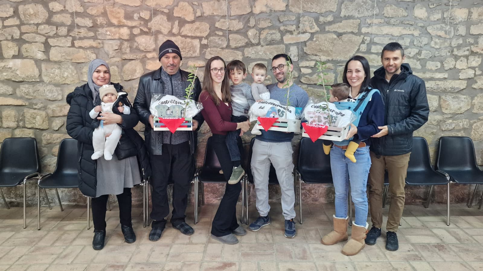 El consistori els va entregar una caixa de fusta personalitzada amb la inicial del nom del nadó, un coixí també personalitzat, un conte, el carnet de la biblioteca, un abonament per a les piscines per al 2026 per als pares, una olivera, un mocador de Castellserà i un paquet de bolquers.