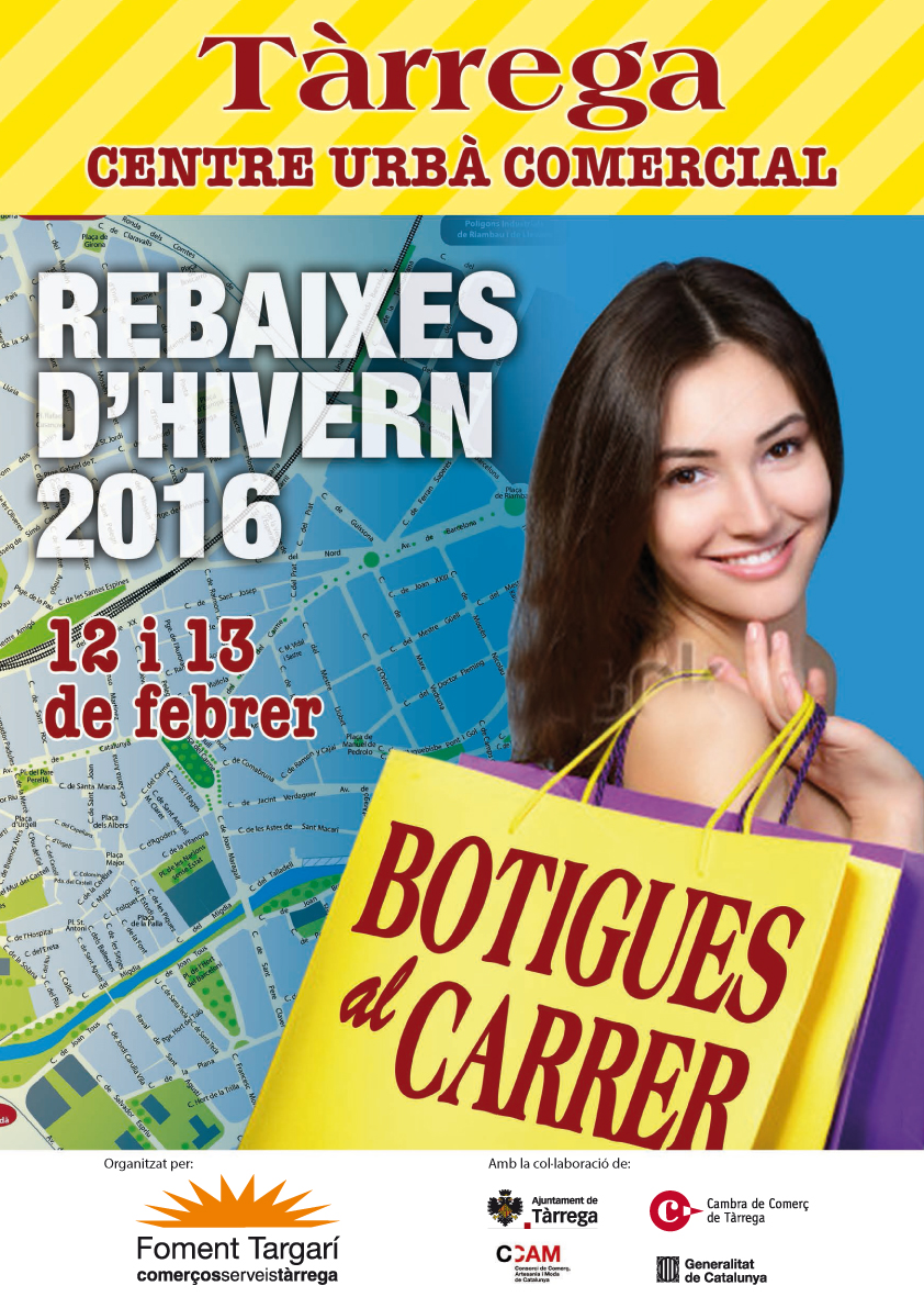 Tàrrega celebrarà demà divendres i dissabte, en horari comercial, una nova edició del seu mercat de rebaixes d'hivern, anomenat Botigues al Carrer. Es tracta d'una acció de Foment Targarí en què es convida tots els establiments comercials del centre urbà, tant si estan associats a l'entitat com no, a traure al carrer parades dels seus productes. Aquesta iniciativa vol esdevenir un imant comercial per atraure més compradors a la ciutat. El mercat de rebaixes d'hivern Botigues al Carrer compta amb el suport de la Regidoria de Promoció Econòmica de l'Ajuntament de Tàrrega; la Cambra de Comerç i Indústria de Tàrrega; i el Departament d’Empresa i Ocupació de la Generalitat de Catalunya.