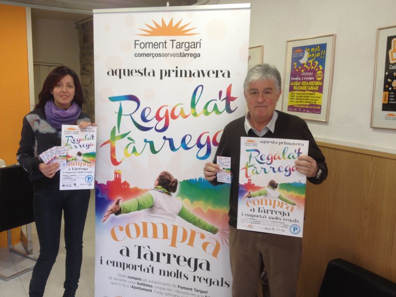 Foment Targarí va presentar ahir la seva campanya de primavera titulada Regala’t Tàrrega. Compra a Tàrrega i emporta’t molts regals. Així doncs, a partir del 4 d’abril i fins al 13 de juny, els comerços associats repartiran butlletes als seus clients i cada dilluns, de l’11 d’abril al 13 de juny es realitzarà un sorteig de deu premis. Es tracta d'una estança d’hotel, dos pack aventura, dos pack relaxació, un pack sorpresa, dos sopars i dos premis de 20 euros en xecs regal. Les butlletes per participar en els sortejos que es faran cada dilluns s'hauran de dipositar a la bústia ubicada al vestíbul de l’ajuntament de Tàrrega.