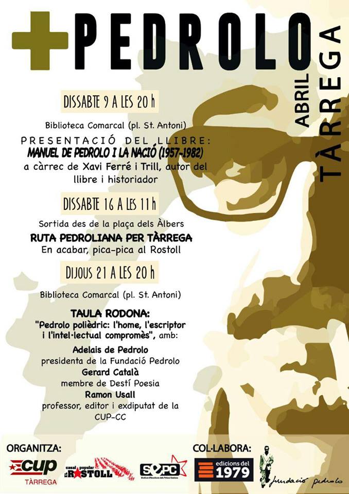 L’esquerra independentista de Tàrrega ha organitzat un conjunt d’actes aquest mes d’abril de 2016 per reivindicar l’obra i la figura de Manuel de Pedrolo. Els col·lectius són el SEPC de l’escola d’Arts i Oficis Ondara, el Casal Popular el Rostoll i la CUP Tàrrega. Els actes compten amb la col·laboració d’Edicions del 1979 i de la Fundació Pedrolo.