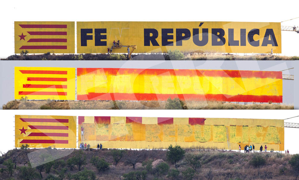El mural independentista més gran de Lleida, d’uns 500 metres quadrats a peu de l’antiga N-II a Bellpuig, va ser repintat durant el dia d’ahir en dos ocasions. Al matí, uns desconeguts van eliminar el lema independentista “Fem República” i van sobreposar la bandera espanyola al llarg de tot el mural. Les xarxes socials s’hi van bolcar en contra. Segons veïns de la localitat, “l’atac es va produir entre les 00.30 i les 5.30 hores”.