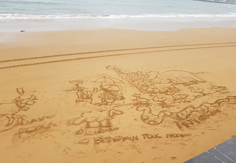 Tous va dibuixar el protagonista de la nostra vinyeta des de fa més de 40 anys i els seus dotze animalons el passat 28 d'agost a les 8 del matí a l'esmentada platja asturiana aprofitant que la marea era especialment baixa i que tenia un paraigües a mà. El que va començar com a una acció individual va culminar com un espectacle visual inesperat, ja que segons ha explicat Tous, quan va acabar i es va girar "vaig adonar-me que estava envoltat de gent que van irrompre en aplaudiments". Tous va afegir que no és el primer cop que comença a dibuixar a la sorra i atreu les mirades del públic que passeja. "De vegades, fins i tot, em tiren monedes", ha explicat.