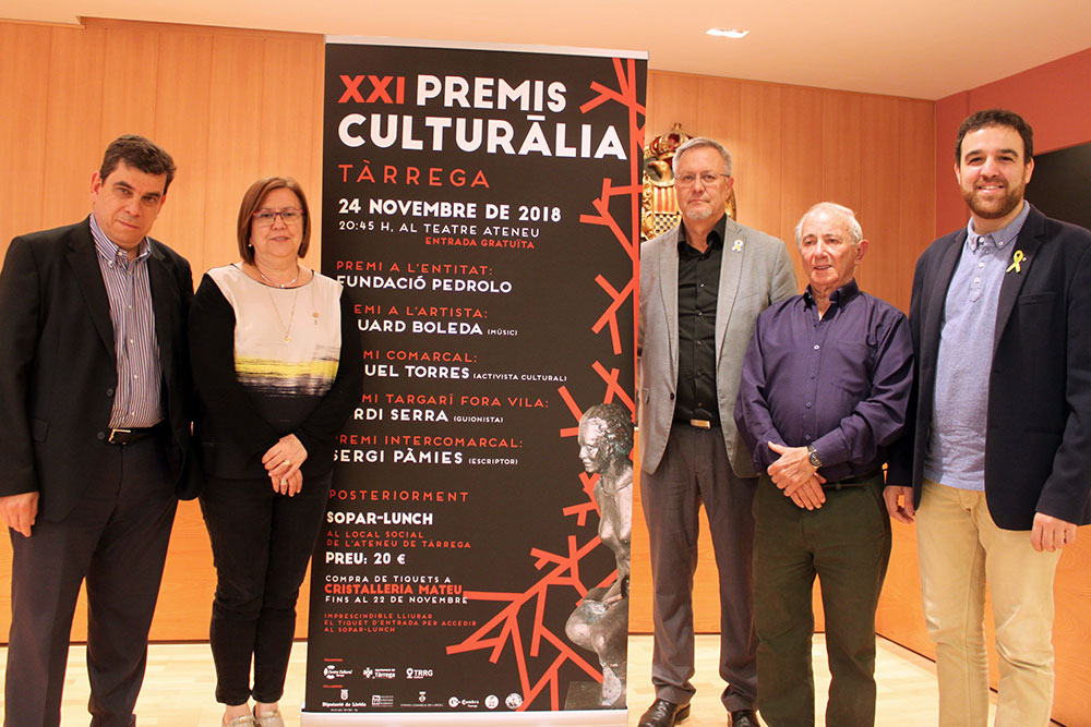 Van anunciar ahir els Premis Culturàlia 2018 Rosa Maria Perelló, alcaldessa de Tàrrega; Salvador Bonjoch, president del Consell Comarcal de l’Urgell; Raül Palacios, regidor de Cultura; Pep Vall, president del Centre Cultural de Tàrrega; i Antoni Palou, director dels Premis Culturàlia (vegeu fotografia). En l’acte es va posar de relleu l’aliança entre institucions per a retre tribut a la gent que treballa en favor del territori i la societat. També s’ha subratllat que les persones i entitats guardonades atresoren un gran valor humà i cultural amb projecció de futur.
