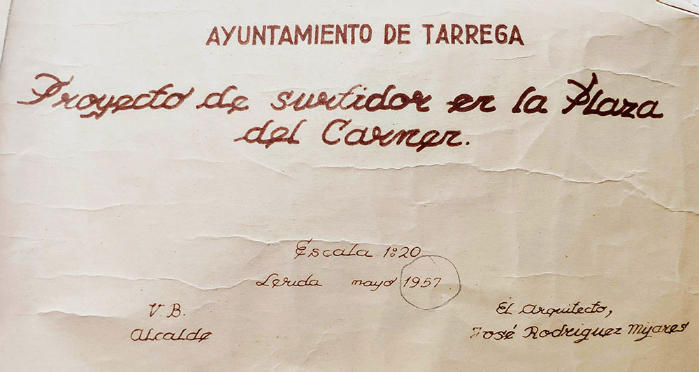 L'empresa Anglo-Española va enviar a Tàrrega part dels plànols de la font, els motors i les bombes, així com els elements de fontaneria i d'electricitat que havien de fer possible el joc d'aigua i de llums un cop construïda i muntada. Amb l'arribada de les primeres eleccions municipals democràtiques i el canvi d'ajuntament, tot aquest material va quedar guardat i oblidat als magatzems municipals durant 18 anys.