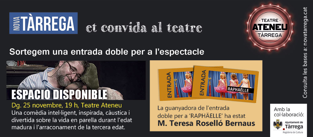 M.Teresa Roselló Bernaus ha estat la guanyadora d'una entrada doble per a l'obra Raphäelle, que es representarà demà a les 9 del vespre al Teatre Ateneu de Tàrrega. Enhorabona i esperem que en gaudeixi!