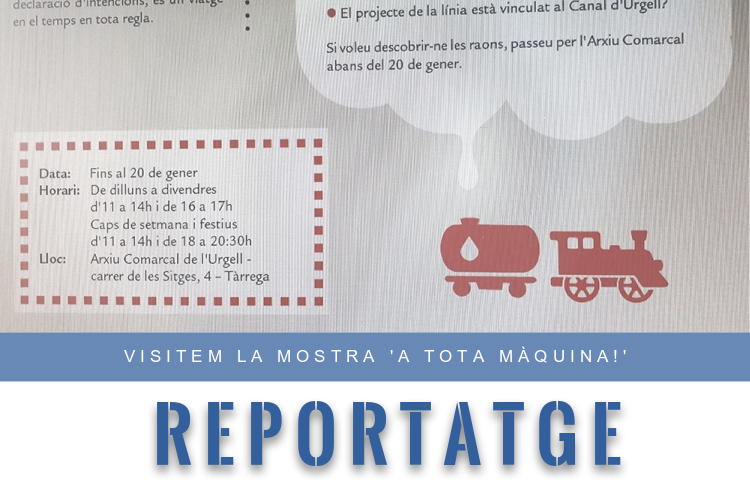 L'Arxiu Comarcal de l'Urgell ens ofereix la possibilitat de fer un viatge en el temps fins al 20 de gener. Com? Visitant l'exposició A tota màquina!, que ens descobreix el projecte de la línia de la xarxa secundària de ferrocarril que havia d'enllaçar Tàrrega amb Balaguer, una mostra que ha estat possible gràcies a la documentació que es conserva a l'Arxiu. L'hem visitat i us expliquem per què no podeu deixar de fer-ho vosaltres al Reportatge que publiquem a l'especial de Nadal d'aquest 21 de desembre.